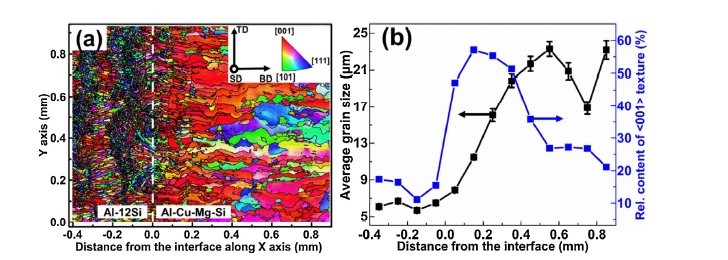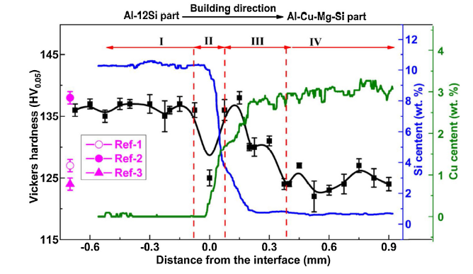 Depending on the above analysis of the microstructures and hardness evolution, the four zones in the Al-12Si/Al-Cu-Mg-Si bimetals along the building direction can be regarded as Al-12Si zone, interfacial zone, texture-strengthening zone, and Al-Cu-Mg-Si zone, respectively.