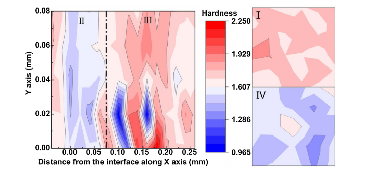 As shown in Fig. 3, it is striking that there is a sudden increase in hardness from zone II to III. In order to accurately characterize the performance of the materials between zones II and III, a contour map of nano-hardness from zone II to III along building direction is depicted in Fig. 4.