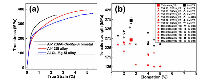 Fig. 6. (a) Tensile true stress-true strain curves of the Al-12Si/Al-Cu-Mg-Si bimetal, the SLM Al-12Si alloy (Ref-2) and the SLM Al-Cu-Mg-Si alloy (Ref-3); (b) A summary of tensile strength (i.e., YS and UTS) versus elongation including our work and conventional bimetals (see Ref. [
