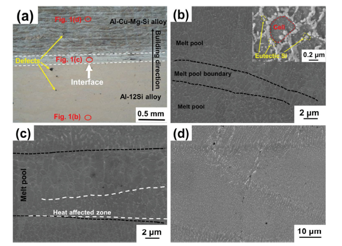 Fig. 1. Microstructures of the SLM Al-12Si/Al-Cu-Mg-Si bimetal: (a) overview of the bimetal with etching at low magnification (OM); (b) SEM micrograph of the Al-12Si part (inset: cellular microstructure at high magnification); (c) the interface of the base alloys (SEM); (d) Al-Cu-Mg-Si part (SEM). The positions of (b-d) are marked by ellipses in (a).