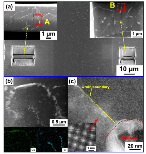 Thin foil specimens were extracted from specific areas using a focused ion beam device (FIB, FEI, Scios) with ultrahigh-resolution SEM capability at an accelerating voltage of 30 kV. A Pt protective layer was deposited on the surface of the specimens and the final milling process was conducted at an accelerating voltage of 2 kV to avoid possible damages or thermal recrystallization. Cs-corrected transmission electron microscopy (TEM, FEI, Titan3 Themis G2) coupled with energy dispersive spectroscopy (EDS) operated at 300 kV in high-angle annular dark field scanning mode (HAADF-STEM) was used to visualize microstructure and reveal local changes of composition and nano-precipitates. All measurements were performed at room temperature.