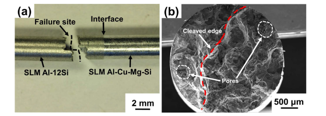 Fig. 7 displays the fracture morphology of SLM Al-12Si/Al-Cu-Mg-Si bimetal. The overview (Fig. 7(a)) at the fracture site along the building direction was observed by optical microscopy. The failure site is at the Al-12Si part, at about 2 mm distance from the interface, which may confirm the explanation reported by Leitão et al. [52]. Failure occurs at the Al-12Si part, at about 2 mm distance from the interface, thus rather far away from the interface. The fact that the fracture occurs at the Al-12Si part points to a good metallurgical bonding of the Al-12Si/Al-Cu-Mg-Si interface. There is no recognizable necking but brittle fracture at the failure site, which is consistent with the low elongation (2.6 ± 0.1%). In general, defects, mainly pores, developing during SLM processing cannot be completely avoided, and these defects have a stronger effect on the failure under the heterogeneous stress distribution present in bimetals [5]. Due to the better damage tolerance of the Al-Cu-Mg-Si alloy compared to Al-12Si [54,55], pores have a more significant effect on the fracture of the Al-12Si base alloy than for the Al-Cu-Mg-Si base alloy. The failure at the Al-12Si part and the pores on the fracture surface (Figs. 7 (a) and (b)) provide evidence for the above analysis.