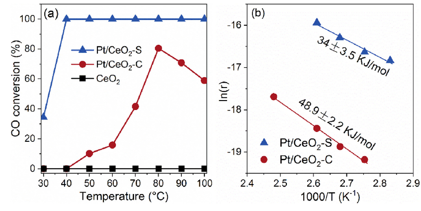 The Pt/CeO2 samples were evaluated by the model reaction of CO oxidation. The CO conversions in Fig. 2(a) demonstrate that the Pt/CeO2-S with coherent interface outperforms the Pt/CeO2-C in a temperature range between 30 and 100 °C. The CO oxidation rate of Pt/CeO2-S catalyst increases rapidly with reaction temperature and reaches complete conversion at 40 °C. In addition, as shown in Fig. 2(b), the apparent activation energy (Ea), measured in the kinetics-control region of Pt/CeO2-S was determined to be 34.0 kJ/mol, which is much lower than the value of Pt/CeO2-C (48.9 kJ/mol). There are likely two contributing factors for the superior catalytic performance of Pt/CeO2-S. First, the fine distribution of Pt NPs size provides more sites for the reaction. Second, the electronic interaction between Pt and CeO2 in Pt/CeO2-S due to the in situ formed coherent interface may be stronger than that in Pt/CeO2-C [34].