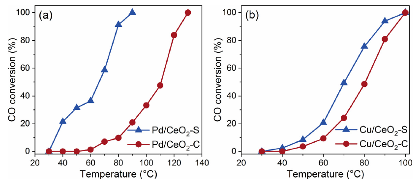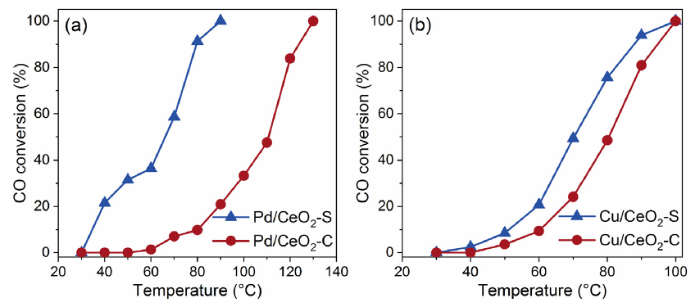 Other metal catalysts (Pd and Cu nanocatalysts) were also prepared via a similar procedure as Pt/CeO2-S to confirm the universal characteristics of the current synthesis method. The CeO2 surface is capable of reducing both Pd and Cu precursors by surface redox reactions. The activity of the resulted Pd/CeO2 and Cu/CeO2 catalysts for CO oxidation were presented on the Fig. 6. For both elements, the catalytic activities of nanocatalysts synthesized by surface redox reaction approach are higher than the corresponding samples prepared by conventional precipitation method. And Pd nanocatalyst exhibits a stronger enhancement effect than Cu, which may result from the different reduction potentials of Pd and Cu precursors. The enhanced catalytic performances demonstrate that the synthetic strategy described here of controlling metal species nucleation during spontaneous redox oxidation reaction is a universal tool for engineering the interface quality of metal-oxide heterostructure nanocatalyst.