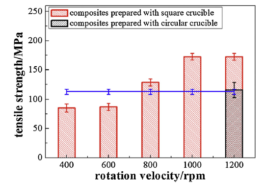 Based on the results above, the change of the crucible shape and rotational velocity will greatly affect the distribution of the short carbon fibers in the Csf/Al composites prepared by mechanical stirring. Thus, the tensile strength of the Csf/Al composites under different crucible shapes and velocities were tested and analyzed, as shown in Fig. 11. With the increase of rotational velocity, the tensile strength of the composites first increases and then tends to be constant. As mentioned above, when the rotational velocity is 400 rpm and 600 rpm respectively, there are a large amount of un-infiltrated defects in the sample. In this case, the un-infiltrated short carbon fibers not only fail to play the role of reinforcement but also decrease the properties of the Csf/Al composites. The tensile strength is only 84 MPa and 86 MPa at the velocity of 400 and 600 rpm, respectively.