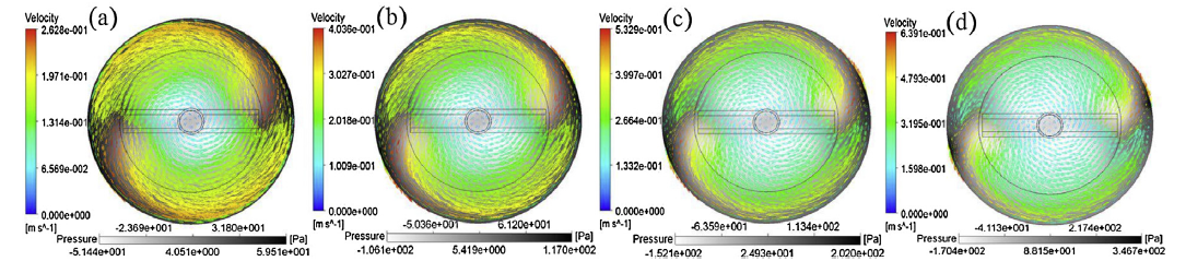 Fig. 5. Flow fields in the round crucible under different rotation velocities: (a) 400 rpm, (b) 600 rpm, (c) 800 rpm, (d) 1000 rpm.