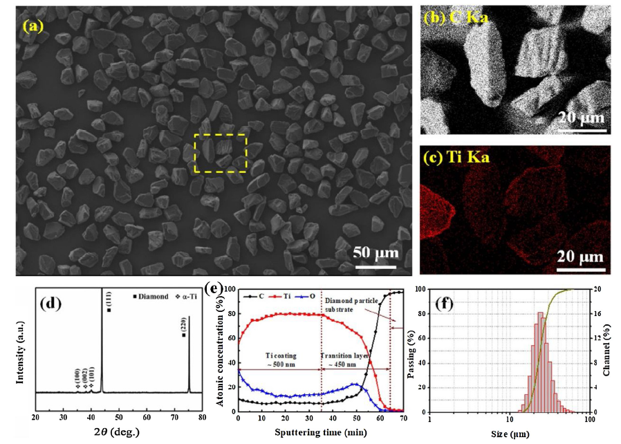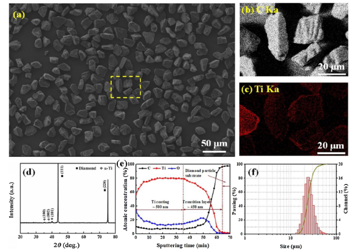 Fig. 1. Typical characteristics of the Ti-coated diamond powders: (a) SEM image of the Ti-coated diamond powders; (b, c) the corresponding EDS maps marked in the yellow detecting position of (a); (d) the XRD pattern of the Ti-coated diamond powders; (e) AES elemental depth profile of the Ti-coated diamond powders (sputtering rate: 15 nm/min); (f) particle size distribution of the Ti-coated diamond powders (D50 = 23.75 μm).