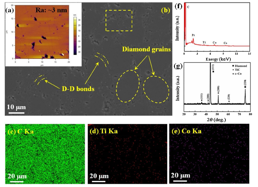 Fig. 2 presents the morphologies and phase compositions of the Ti-PCD. As shown in Fig. 2(a), the surface roughness average (Ra) of Ti-PCD reaches a value of ∼3 nm. In comparison to the typical micrograph of the Ti-PCD surface and its corresponding EDS maps in Fig. 2(b)-(e), it can be observed in that the Ti and Co elements distribute along the boundaries of diamond grains. The D—D bonds can be observed at the interfaces of the diamond grains, which demonstrate that excellent bonding among diamond grains was achieved for the Ti-PCD after the sintering process. The bonding guarantees that the PCD process excellent physical and mechanical properties [23,30]. In addition, some tiny holes distribute along the boundaries of the diamond grains, which is formed during the sintering process due to the exfoliation of the fine diamond powders. To understand the phase structure of the Ti-PCD, the XRD was performed. It is presented in Fig. 2(g) that three new peaks located at 2θ = 35.9°, 41.8° and 60.7° correspond to (111), (200) and (220) crystal planes of a titanium carbide (TiC) phase, respectively, which replace those of Ti phase for Ti-coated diamond powders. This phenomenon indicates that the Ti coating deposited on diamond powders has interacted with diamond and formed a TiC phase during the sintering processing.