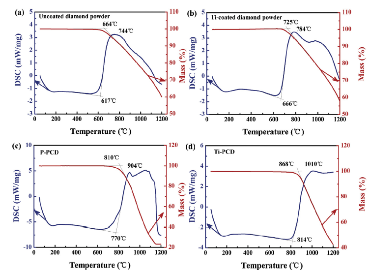 The thermal stability of the diamond composites strongly relies on the diamond types, synthesis methods and catalysts. The thermoanalytical study of diamond powders and PCD with TG-DSC is given in Fig. 3. For the uncoated diamond powders, a weight loss of ∼1 wt% occurs from 20 °C to ∼600 °C, which is attributed to the release of absorbed gases or moisture on the surfaces of diamond powders. Moreover, when the temperature increases from approximately 664 °C, the mass curve shows an abrupt decreasing trend, accompanying by a strong oxidized exothermal peak in DSC curve. This indicates that the uncoated diamond powder begins to oxidize at this temperature, and the gaseous products leads to substantial mass loss. For the Ti-coated diamond powders, as seen in Fig. 3(b), it reveals a stronger oxidized exothermal peak of diamond at ∼725 °C, which is ∼50 °C higher than that of the uncoated diamond powders. In addition, note that a small quantity of weight gain accompanied by a stronger exothermal peak was observed in the temperature range of ∼200 °C to ∼725 °C, which might be due to the oxidation of Ti coating. Therefore, it can be confirmed that the oxidation of Ti coating occurs prior to that of the diamond powder. When heated in oxygen-containing environment, the Ti coating on the Ti-coated diamond powders contacts with oxygen and leads to an anterior oxidation. Then, the interior diamond powder begins to be oxidized after that of the Ti coating. Namely, the Ti coating acts as an oxygen barrier to prevent immediate oxidation of diamond powders during annealing treatment, hence yields to an improved oxidation resistance of Ti-coated diamond powders.