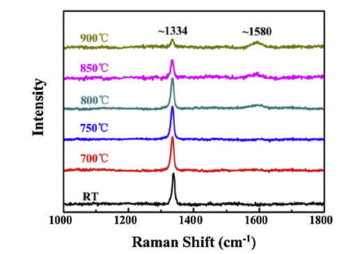 The Raman spectroscopy was carried out to study the chemical characteristics of annealed Ti-PCD surface. As shown in Fig. 5, it presents only a sharp diamond peak (∼1334 cm-1) at the annealing temperatures of RT, 700 °C and 750 °C, which infers that the Ti-PCD surface annealed at these temperatures is composed of diamond grains with high purity [18]. For the high temperatures above 800 °C, a broad G peak [32] centred at ∼1580 cm-1 appears. The G peak demonstrates that the diamond grains begin to graphitize [33,34]. This result confirms that the Ti-PCD begins to graphitize at ∼800 °C in air, which increases by ∼100 °C to that of the P-PCD. In a word, the Ti-PCD possesses a better graphitization resistance than the P-PCD in air.