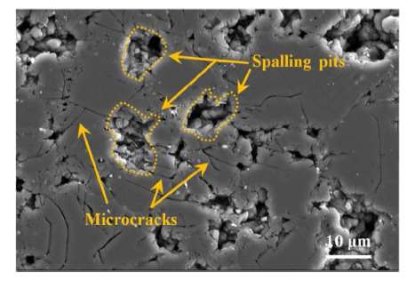 As presented in Fig. 6, the SEM morphology features of annealed Ti-PCD surfaces strongly depend on the annealing temperature, especially at high temperatures. Fig. 6(b) and (c) reveal no much visible variation for the Ti-PCD surfaces annealed at 700 °C and 750 °C compared to that of the original sample (Fig. 6(a)), demonstrating that no much chemical reaction occurs at these temperatures. In addition, some spalling pits, which are bigger than the tiny holes of the original Ti-PCD surface, distribute along the diamond boundaries. An acceptable explanation is related to the exfoliation of tiny intergranular diamond grains and the mismatch of thermal expansion coefficients among the diamond, TiC and Co phases [29]. An enlarged SEM image for the Ti-PCD surface annealed at 750 °C is presented in Fig. 7. Notably, a large number of microcracks can be observed around the spalling pits, some of which propagate and converge. For the Ti-PCD, there are some tiny intergranular diamond grains among the original defects of the Ti-PCD surface, and they are inclined to exfoliate when heated, thus yields to the appearance of spalling pits [18]. In addition, the mismatch of thermal expansion coefficients among diamond (3.2 × 10-6 K-1), TiC (7.2 × 10-6 K-1) and cobalt (14.4 × 10-6 K-1) might lead to a high thermal stress and hence induce the formation of microcracks [35,36]. Finally, the further propagation and conversion of the microcracks would result in the exfoliation of fine intergranular diamond grains exfoliate, and thus some spalling pits appear.