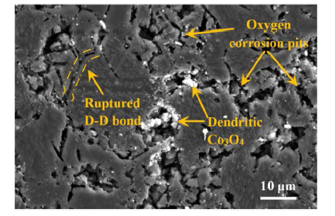 When the annealing temperature reaches 800 °C, a very large amount of oxygen corrosion pits distribute along the boundaries of diamond grains without any D-D bonds on the Ti-PCD surface. In addition, the substantial exfoliation of fine diamond grains leads to a large amount of spalling pits. An enlarged SEM image of the thermal surface is revealed in Fig. 8. It can be conducted that some tiny sintering holes, which form during the synthesis process and distribute along the diamond boundaries, offer substantial contact space for oxygen and induce the oxidation of diamond grains. In this case, the gaseous products of diamond oxidation lead to the formation of imperfections (oxygen corrosion pits) on the Ti-PCD surface. In addition, the XRD result has demonstrated that the cobalt-catalytic graphitization has occurred in the Ti-PCD at high temperatures above 800 °C, which causes cracking and thus exposing more surfaces to for oxidation. This indicates that the cobalt-catalytic graphitization of diamond might indirectly accelerate the oxidation of Ti-PCD. In other words, the cobalt catalyst is substantially harmful to the thermal stability of the PCD. In literatures, the oxygen corrosion of PCD, which results in a large amount of oxygen corrosion pits, always begins at the boundaries of diamond grain and gradually propagates with further oxidation, thus yields to the ruptured D-D bonds and sharply deteriorated mechanical properties of PCD [23,30]. What must be pointed out that the thermal damage morphology of the Ti-PCD surface annealed at 800 °C reveals similar features with that of the P-PCD annealed at 750 °C (seen in our previous work [18]). It confirms that the initial oxidizing temperature of Ti-PCD elevates by ∼50 °C than that of the P-PCD. Namely, the Ti coating on diamond powders postpones the oxidation temperature of PCD and improves its oxidation resistance. This phenomenon has also been confirmed by the TG-DSC.