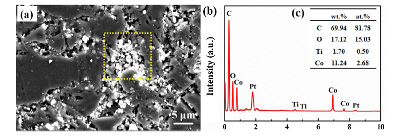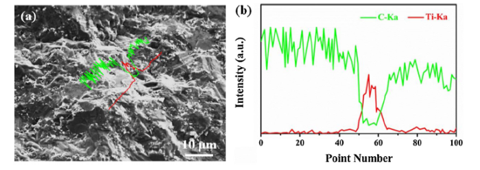 The above SEM morphologies and corresponding EDS maps demonstrate that the TiC phase distributes along the boundaries of diamond grains. To further verify this result, the chemistry of the interface area has been analysed by EDS line scans. The test surface of Ti-PCD was obtained by the impact treatment. As it given in Fig. 10(a), a diamond grain and spalling pit can be observed on the broken Ti-PCD surface, which might be caused by the inter-granular fracture during the impact treatment. Following the scanning path, a diamond grain is crossed, followed by the interface before entering the spalling pit. The C signal reveals a stable and strong intensity on the diamond grain, while rare Ti signal can be detected. In addition, the interface layer presents a sharply increased signal of Ti, accompanied by the decreased C. Following the interface, the scan enters the spalling pit, where the Ti signal drops to the detection limits, while the C signal abruptly increases to a stable stage. This indicates that the TiC layer forms along the boundaries of diamond grains in the Ti-PCD, which is corresponding to the above SEM results.