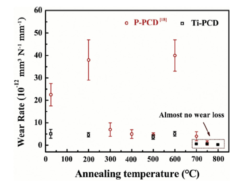 Fig. 12. Wear rates of the PCD discs annealed at different temperatures. The black scatters reveal the wear rates of Ti-PCD annealed at different temperatures, and the red scatters show those of the P-PCD [