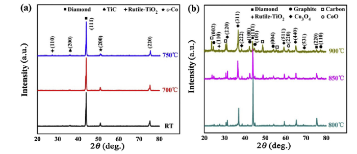 Moreover, the appearance of graphite peaks demonstrates that the graphitization of Ti-PCD occurs at 800 °C. The graphite peaks tended stronger with the degradation of diamond peaks when the samples were annealed at higher temperatures, which indicates that a much severer graphitization of Ti-PCD takes place at elevated annealing treatment. Our previous work [18] has reported that some graphite phase appeared on the P-PCD surface annealed at 700 °C. Notably, the initial graphitization temperature of Ti-PCD is ∼100 °C higher than that of the P-PCD. This indicates that an enhanced graphitization resistance of PCD has been achieved in this work, which would be of great benefit to the service life of PCD drilling bits. In addition, the degradation of diamond peak mainly comes from the oxidation of diamond phase. Gaseous products are demonstrated to be generated due to the diamond oxidation, which leads to the substantial thermal loss of the Ti-PCD [30]. Moreover, the TiC peak almost completely fades away at the temperature ranging from 800 °C to 900 °C, accompanying by the appearance of TiO2 peak. According to the above SEM results that the oxidation of TiC has been observed at 750 °C and the TG-DSC results, it can be verified that the TiC is oxidized priorly to the diamond, which occurs at approximately 800 °C. In this case, the oxidation of TiC postpones the diamond oxide during the annealing treatment and thus improves the oxidation resistance of Ti-PCD.