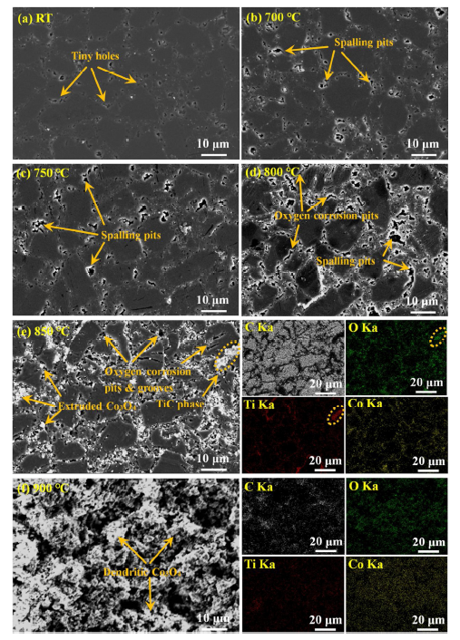 With the annealing temperature increases further, the thermal damage morphology tends completely different. Fig. 6(f) shows the morphology features of the Ti-PCD annealed at 900 °C. It is difficult to detect diamond grains but the dendritic structures. Moreover, the EDS mapping results reveal rare C element on the annealed Ti-PCD surface, demonstrating that the diamond has almost been completely oxidized. Instead, a large amount of Co and O uniformly distribute on the detecting surface. It confirms that the dendritic phase is the extruded cobalt oxide. The slight Ti distribution may come from the oxidation of TiC phase. Therefore, when the Ti-PCD is annealed at 900 °C, substantial oxidation occurs, which contains that of the diamond grains, TiC and cobalt phases, thus causing severe oxidized thermal damage.
