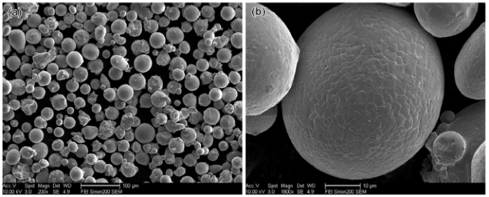 SEM images of CoCrMo alloy powders at low (a) and high (b) magnification.