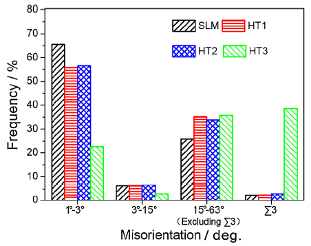 A similar GBCD result was also obtained for the as-SLM, HT1, and HT2 samples (Fig. 11(a’-c’) and Fig. 11(e’-g’)). Very dense sub-grain boundaries, as an indicator of dislocations, represented by purple lines were present due to the high residual internal stress during SLM. Post aging might lead to recovery to a certain degree, but the dislocation density is still very high. Only after annealing at 1150 °C, columnar grains disappear and homogenized microstructure (Fig. 11(d) and (h)) was resulted both in the transverse and longitudinal cross-sections. And the dislocations and therefore sub-grain boundaries are near completely dissolved and recrystallization grains containing many annealing twins emerge in Fig. 11(d’) and (h’). The fractions of various grain boundaries including twin boundary (TB) with the angle/axis pair of 60°/<111> are shown in Fig. 12. It was suggested that a large population of TBs is generated at the expense of sub-grain boundaries with misorientation of 1°-3° [30]. It is well recognized that twin boundaries, typically referred as special grain boundaries due to possessing the extremely low interface energy compared to general high angle grain boundaries, have the potential to enhance the intergranular corrosion resistance when they are highly populated in FCC metals [31,32]. It is expected to improve the corrosion resistance of CoCrMo alloys when used in biomedical applications.