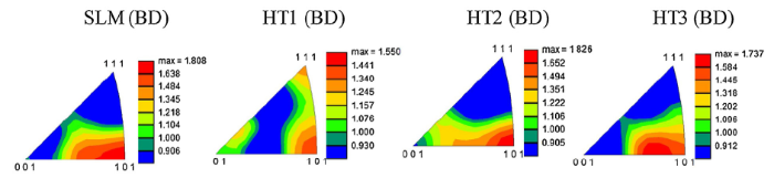 Fig. 13 shows the inverse pole figure (IPF) in BD, indicating that a very weak fiber texture of <110> // BD was present for the as-SLM sample with the intensity of less than 2. Upon subsequent heat treatment, the texture almost doesn’t change. The cubic texture (<001 > // BD) is usually found in FCC γ phase after SLM [2,[33], [34], [35], [36]] despite <110> //BD type fiber texture is also observed in the SLMed NiCr γ phase [[37], [38], [39]]. Takaichi et al. [2] analyzed the influence of input energy density on the SLMed Co-29Cr-6Mo alloy via modifying the laser powder from 75-200 W and laser scanning space 0.1-0.3 mm with the scanning speed of 50 mm/s. They observed that the γ phase has a preferential <001> orientation in the building direction at the lower input energy. In the current study, the input energy is approximately 90 J/mm3, which is lower than that (100-800 J/mm3) employed in Takaichi’s study. The nearly random texture is quite different from the results obtained in Takaichi’s study. The big discrepancy might come from two aspects. The first is the chemical composition difference in the material employed in the two studies. Higher Cr and Mo contents in the Takaichi’s study might have an influence on the resulted texture. The second one might be attributed to the difference in scan strategy and speed. In this study, the chessboard in every layer and a 67° rotation of the laser vector between successive layers were employed to change the melt pool orientation and therefore the solidification region between layers, especially at the high scanning speed of 1200 mm/s. As a result, the strong epitaxy growth might dissolve as shown in Fig. 11. It is expected that a larger and deeper melt pool caused by the higher energy density generates a strong columnar grain structure with significant <100> texture along the build direction [2,40,41]. However, the low energy density was produced in the current study due to the high scanning speed of 1200 mm/s, which is much higher than 50 mm/s employed in Takaichi’s study on the SLMed CoCrMo alloy. Therefore, the strong columnar grains with the <100> texture may not be sustainable and could be changed, for instance, into <110> direction.