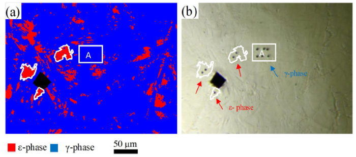 Nanohardness examination of ε-phase and γ-phase: (a) EBSD reconstructed phase distribution; (b) nanoindentation within the ε and γ phases.