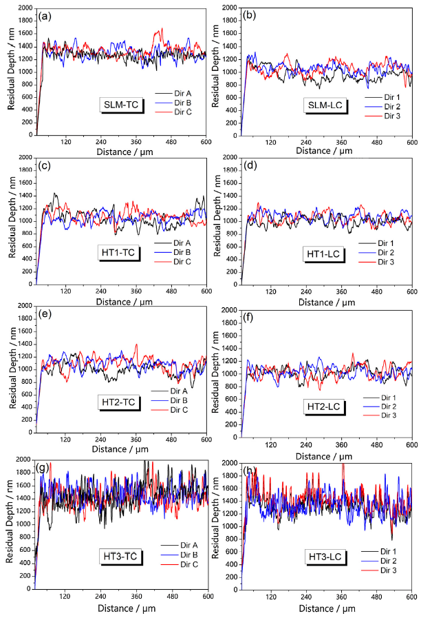 In addition, the anisotropy in residual depth was clearly observed in the as-SLM, HT1, and HT2 samples in Fig. 16, Fig. 17, Fig. 18. Overall, low residual depth and friction coefficient on the longitudinal cross-sections was obtained than those on the transverse cross-section. It suggests that the improved tribological property be achieved on the longitudinal cross-section parallel to the building direction. Dense elongated columnar grains and hardness gradient along the building direction on the longitudinal cross-section might contribute to improved tribological property. For the examined sections, the tribological property also has slight anisotropy along with different directions in the samples. Along the building direction, the residual depth is the lowest among the three different directions. The marginal improvement of the tribological property might due to the fine long columnar grain with weak <110> texture along the building direction. It should be noted that nearly no anisotropy in tribological property in the HT3 sample due to its homogeneous microstructure.