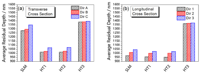 Hardness and scratching resistance were measured using a Berkovich nanoindenter (Nanotest Vantage Alpha) for the as-SLM and aged samples at room temperature. The indents were made using load-controlled mode at 200 mN with the loading and unloading rate of 10 mN/s and 8 mN/s, respectively. The dwell time is 10 s at the target load. In order to generate the data with a statistical nature, at least 5 indentations were selected at the bottom, middle, and top locations to generate a total of 15 measurements performed on the longitudinal cross-sections.
