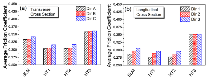 (4) The friction coefficients on the longitudinal cross-section are lower than the transverse cross-sections for the as-SLM and heat-treated samples. This anisotropy in friction performance may be considered when designing CoCrMo medical implants using laser additive manufacturing.