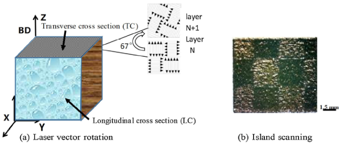 All samples were prepared by SLM on an EOS M270 machine on the 316 L stainless steel baseplate of 250 mm × 250 mm at the deposition conditions in Table 2. The scanning strategy and the corresponding building direction (BD) are shown in Fig. 3(a). A 67° rotation of the laser vector between successive layers was employed. The chessboards with each having an area of 3000 μm × 3000 μm can be seen on the last layer morphology in Fig. 3(b).