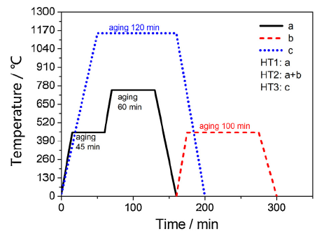 After SLM fabrication, three subsequent heat treatment routes HT1, HT2, and HT3 (Fig. 4) were performed in an argon atmosphere to minimize oxidation. The HT1 samples were heated up to the 450 °C with a rate of approximately 30 °C/min and held for 45 min., and then reheat the sample to 750 °C and held for 60 min. Furnace cooling to room temperature was employed. Additional aging for 100 min. at 450 °C was conducted for HT2 samples. The recrystallization annealing at 1150 °C for 120 min. was employed for the HT3 samples.
