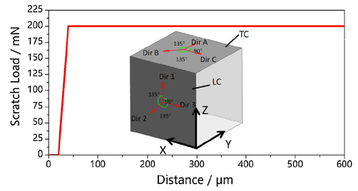 At least three loading paths on both the longitudinal cross-section (LC) and transverse cross-section (TC) were selected to perform the nano scratching tests (Fig. 5). The nanoindenter with a penetration load of 200 mN and a constant loading speed of 10 mN/s was used. The scratching length was 600 μm and the first 20 μm length from the start point was not loaded. The load increased along the path varying from 20-40 μm at a speed of 10 mN/s and then the load of 200 mN was uniformly applied on the sample surface as shown in Fig. 5.