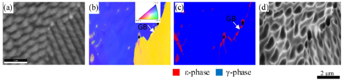 However, the extremely small amount of ε phase suggested that the ε phase might be resulted by the in-situ aging heat treatment. That is, the previous build layer was repeatedly heated by the subsequent melting layers. Upon subsequent aging (HT1 and HT2), nearly 10% ε phase is induced, which should be isothermally phase transformation when aging at a temperature between 650 -950 °C [[23], [24], [25], [26], [27]]. A very limited ε phase in the sample HT3 suggested that nearly no ε phase transformation occurs upon high-temperature annealing. Kajima’s study [22] also evidenced that the amount of ε phase decreased when increasing the heating temperature and approached to zero at 1150 °C.