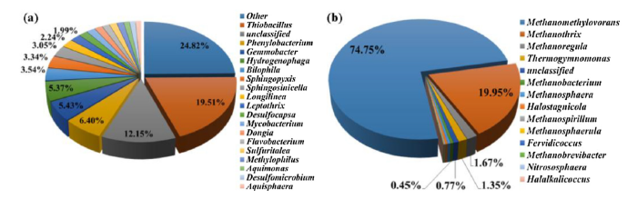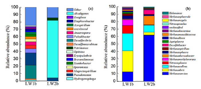 Relative distribution of (a) bacterial and (b) archaeal 16S rRNA gene sequences at the genus level in the raw LW used for this study.
