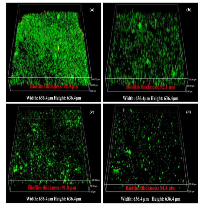 Live/dead CLSM 3-D images of biofilms and biofilm thickness from (a) X52 steel exposed to LW1 for 14 days, (b) X52 steel exposed to LW2 for 14 days, (c) X52 steel exposed to LW1 for 30 days, and (d) X52 steel exposed in LW2 for 30 days. LW1 represents incubation in lake water alone, and LW2 represent incubation in lake water with added 2216E culture media.