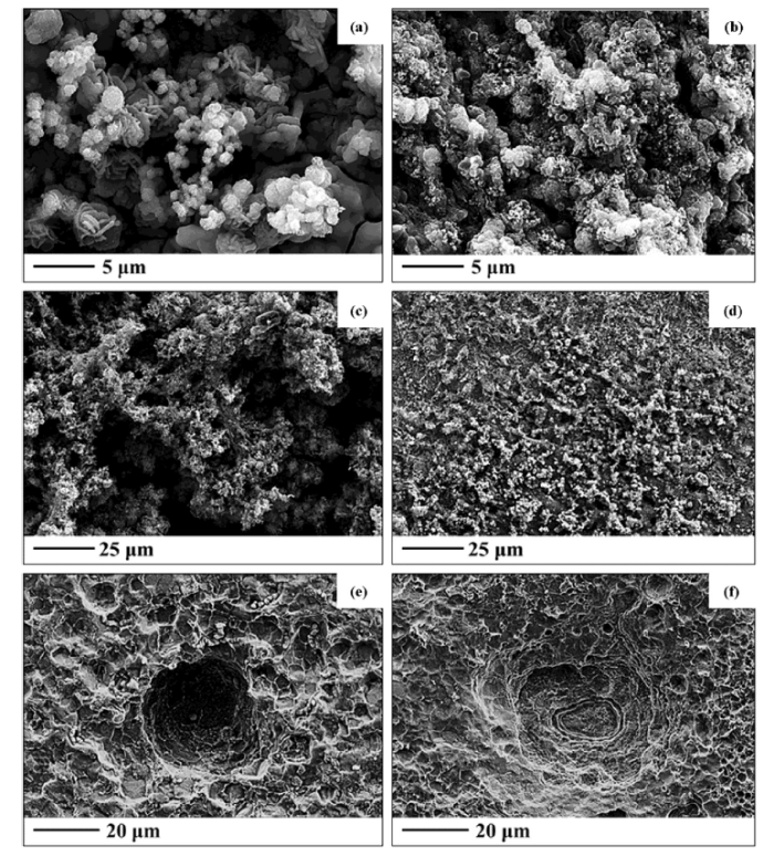 FESEM images of X52 steel surfaces after (a) exposing to LW for 14 days, (b) exposing to LW for 30 days, (c) exposing to GW for 14 days, (d) exposing to GW for 30 days, (e) removal of the biofilm from coupons exposed to LW for 14 days, and (f) removal of the biofilm from coupons exposed to LW for 30 days.