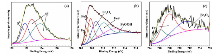 (a) S 2p peak of X52 steel coupon surfaces after exposure to LW solution for 30 days, (b) Fe 2p3/2 peak of X52 steel coupon surfaces after exposure to LW solution for 30 days, and (c) Fe 2p3/2 peak of X52 steel coupon surfaces after exposure to GW solution for 30 days.