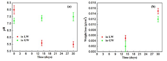 (a) Variation in pH of GW and LW after 14 and 30 days of laboratory hydrostatic testing. (b) Weight loss of triplicate X52 steel coupons after exposure to GW or LW after 14 and 30 days.