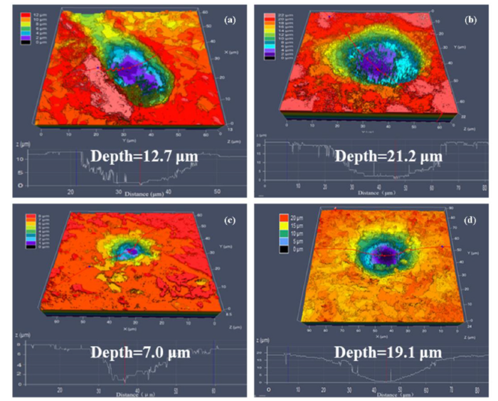 CLSM 3-D images were used to determine pit depths on X52 steel coupon surfaces after immersion in GW or LW (Fig. 5, Table S3). Pits were uniform, and the maximum pits were observed in coupons exposed to LW where pitting depth reached up to 26.1 μm after 30 days of exposure (Table S3). However, the depth of the maximum pit observed after 30 days of exposure in GW solution was only 19.1 μm, with an average pitting depth of about 12.4 ± 4.7 μm (Fig. 5(d), Table S3). The average maximum pit depth (20.7 ± 3.6 μm) of X52 steel pits after exposure to LW for 30 days was also higher than many previously reported pit-depths in corroded materials [19,75]. These results demonstrated severe bacterial attack on X52 steel surfaces after incubation in LW.