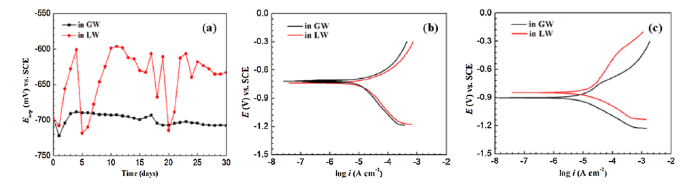 (a) Variation in OCP with exposure time, and polarization curves of X52 steel coupons after exposure to LW or GW solutions for (b) 14 and (c) 30 days.