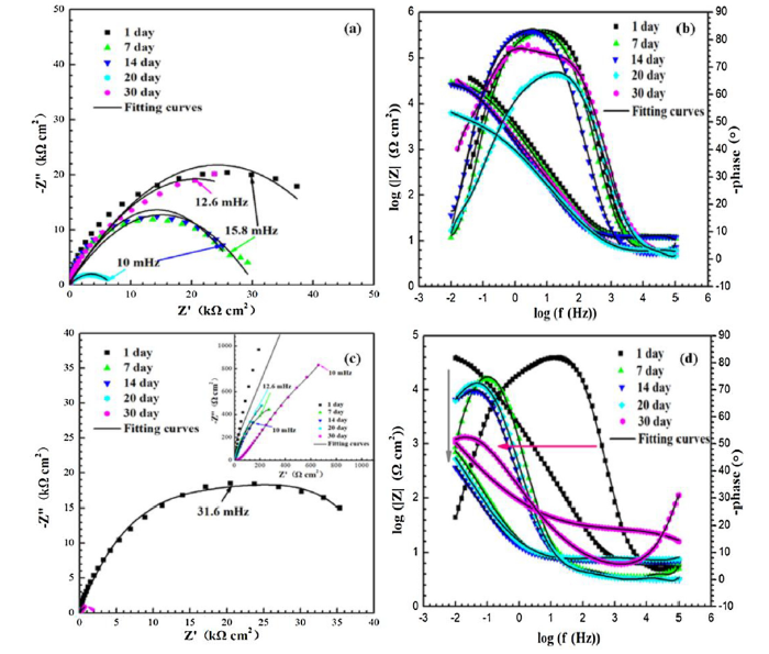 Nyquist and Bode plots of X52 steel coupons after 30 days of exposure to (a, b) GW and (c, d) LW, respectively.