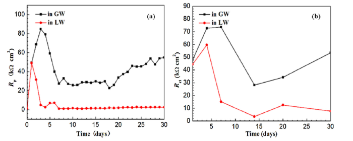 Polarization resistance (Rp) (Fig. 9(a)) and Rct (Fig. 9(b)) were also measured for X52 steel coupons exposed to GW or LW at different exposure times. The results verified that severe corrosion and pitting on the X52 steel coupons were caused by bacterial biofilms. The Rp trend was similar during the initial 7 days of exposure to GW and LW, due to similar surface activity and instability (Fig. 9(a)). Thereafter, Rp of the X52 steel coupons exposed to LW reached its lowest value and stabilized for the remaining 30-day duration. For the X52 steel coupons exposed to GW, Rp was stable at first and then increased due to formation of protective oxide layers on the steel surface. Rct variations over time showed a similar trend (Fig. 9(b)). Rct is 10 times higher in X52 steel coupons exposed to GW compared to LW, which suggests that the presence of bacteria accelerates electron transfer between X52 steel coupon surfaces and solution.