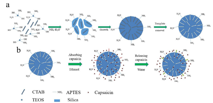 Schematic of the synthesis of porous SiO2-NH2 nanoparticles (NPs) (a) and capsaicin absorption-release abilities (b).