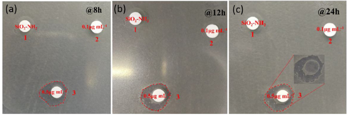 Antibacterial activity of SiO2-NH2@capsaicin NPs at (a) 8 h, (b) 12 h and (c) 24 h against E. coli (insert: part 3, after the paper was removed). SiO2-NH2 NPs, 0.1 μg mL-1 SiO2-NH2 @capsaicin NPs, and 0.5 μg mL-1 SiO2-NH2@capsaicin NPs were added to parts 1 to 3, respectively.