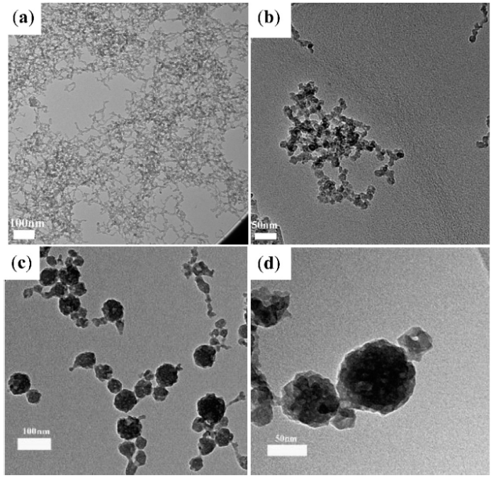 TEM images of FL-SiO2-NH2 NPs obtained by the traditional order (first tetraethylorthosilicate then (3-aminopropyl) triethoxysilane) of reagents addition (a), MD-SiO2-NH2 NPs obtained by the control order (tetraethylorthosilicate and (3-aminopropyl) triethoxysilane at the same time) for 4 h (b), SiO2-NH2 NPs obtained for 12 h (c) and individual SiO2-NH2 NPs (d).