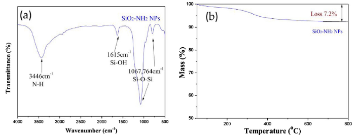 Fourier transforms infrared (FT-IR) spectrum (a) and thermogravimetric analysis (TGA) curve of SiO2-NH2 NPs (b).