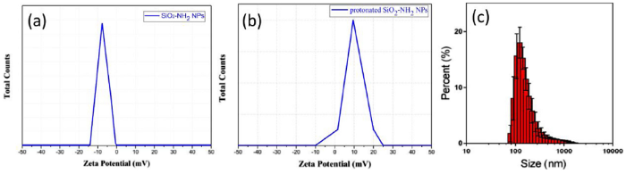 Zeta potential of SiO2-NH2 NPs (a), protonated SiO2-NH2 NPs (b) at pH = 7 in the aqueous phase and the hydrodynamic particle sizes (c).