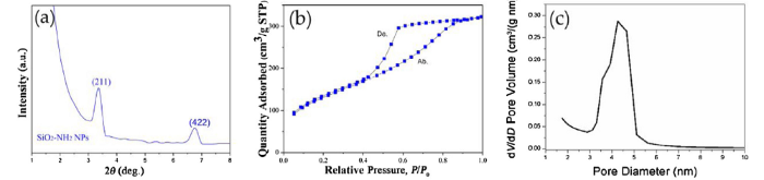 Small-angle XRD patterns of SiO2-NH2 NPs (a), nitrogen adsorption-desorption isotherm of SiO2-NH2 NPs (b) and pore size distribution of SiO2-NH2 NPs (c).