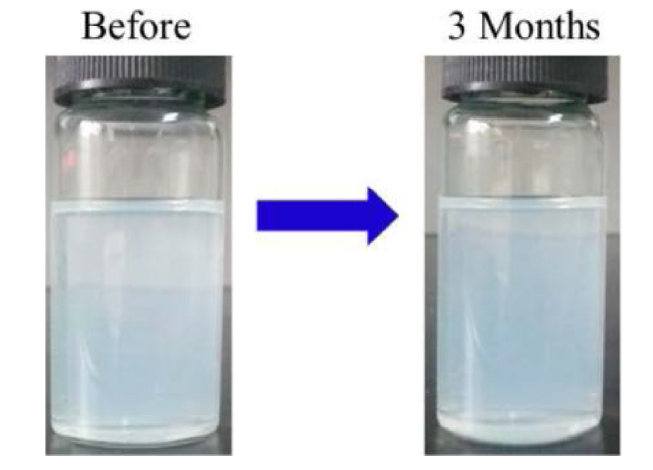 Porous SiO2-NH2 NPs dispersed in water before and after three months.