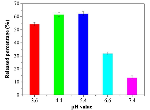 Released epirubicin (EPB) percentage from SiO2-NH2@EPB NPs at different pH values (3.6, 4.4, 5.4, 6.6, and 7.4). Each independent experiment was tested three times.