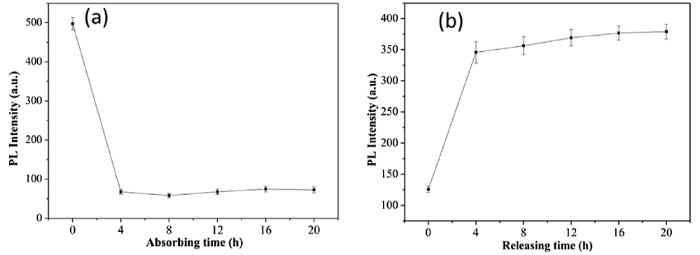 Photo-luminescent (PL) intensity of capsaicin residue in ethanol after SiO2-NH2 NPs were immersed in capsaicin-ethanol solution for different absorption times (a) and capsaicin release in water for different releasing times (b). Each independent experiment was tested three times.