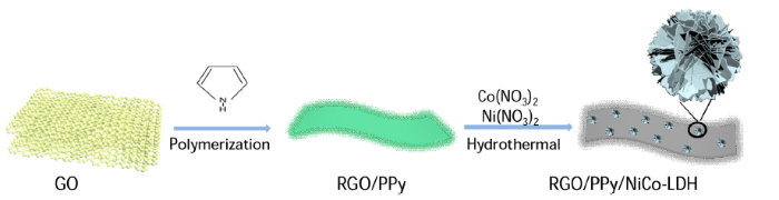 Schematic illustration of the fabrication procedure for RGO/PPy/NiCo-LDH composite.